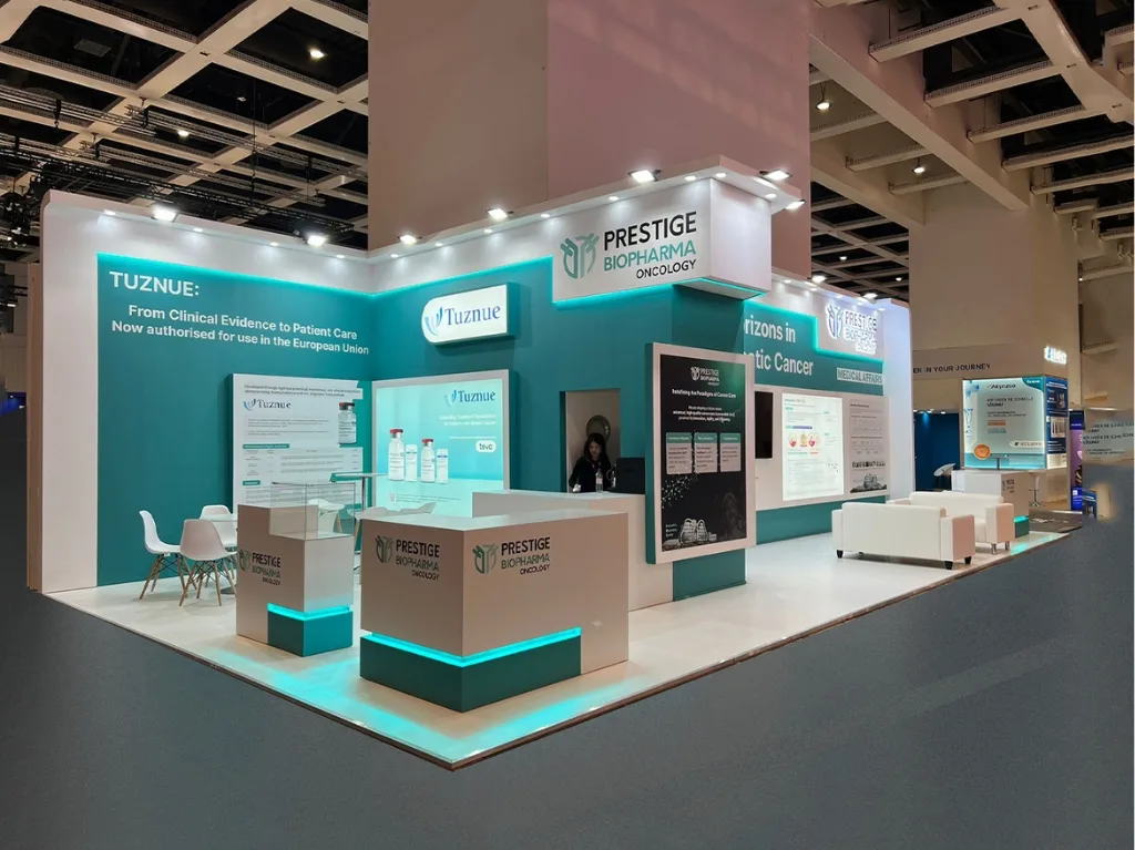 For Prestige Biopharma, our scope was to create a booth that clearly signified scientific credibility, world ambitions, and aspirational brand value. We start every project understanding the vision and message that needs to be portrayed by the brand, which enabled us to create a booth that was both sophisticated and visually pleasing. The design language was simple, ordered, and forward-thinking.